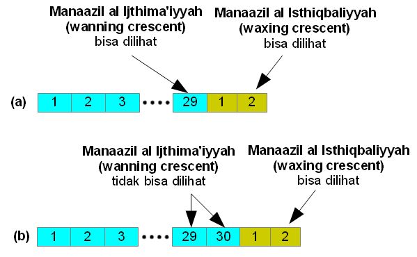 Pada hari terakhir, bulan berada pada sisi yang tidak terlihat dari bumi. Hari berikutnya, ketika bulan bergerak 12 derjat menjauhi matahari, Hilaals terlihat kembali. Orang-orang Arab menyebut ‘waxing crescent’ sebagai ‘manaazil al ijthima’iyyah’ dan ‘waning crescents’ sebagai ‘manaazil al isthiqbaliyyah’.